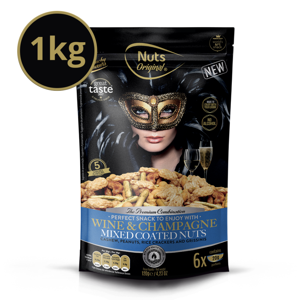 Ingredientes: Amendoins revestidos clássicos (40%) (Amendoim (52 %), amido de milho, amido modificado, óleo vegetal, maltodextrina, dextrose, sal, cebola em pó, soro de LEITE em pó, temperos, açúcar, farinha de TRIGO (glúten), intensificadores de sabor: ácido glutâmico, glutamato monossódico, guanilato dissódico, inosinato dissódico; reguladores de acidez: ácido cítrico, ácido acético; MOSTARDA, agente de aumento: carbonato de amônio; cores: urucum, extrato de páprica;aromas); amendoim e caju com mel (25%) (amendoim (60,8%), açúcar (18,5%), caju (15,2%), mel (3,5%), sal marinho (2%)); caju (15%) (castanha de caju (96%), óleo vegetal (palma, girassol) (3%), sal (1%)); bolacha de arroz redondo frito (10%) (de arroz (64%) (arroz, açúcar, suco de melancia, sal, óleo de palma), óleo de palma, açúcar, molho de soja em pó (soja, TRIGO (glúten), sal, maltodextrina), sal, maltodextrina, extrato de fermento); Palitos de pão crocantes com manjericão e alho (10%) (farinha de TRIGO (glúten) (71,2%), azeite (12%), levedura de cerveja (3,7%), óleo de palma (3,5%), Malte (TRIGO (glúten)) (3,2%), manjericão (3%), sal (3%), alho (0,3%)).