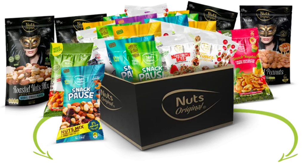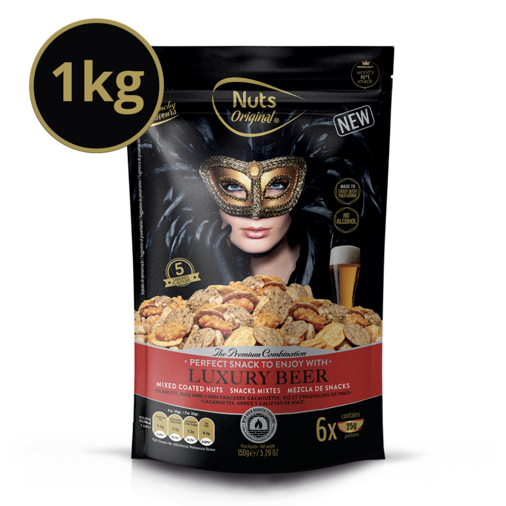 Ingredientes: Amendoim revestido sabor de paprica (51%) (amendoim 52%, amido de milho, amido modificado, óleo de palma refinado, maltodextrina, dextrose, sal, açúcar, farinha de TRIGO, paprica (0,5%), intensificadores de sabor: glutamato monossódico, guanilato dissódico, inosinato dissódico; acidez regulador: ácido cítrico; agentes de aumento: carbonato de amônio; cores: urucum, extrato de paprica; aromatizantes); amendoim revestido aroma a fumaça (37%) (amendoim (76%), farinha de TRIGO (GLÚTEN), tempero de fumaça (aroma (LEITE) (3,1%), aroma de fumaça, amido de batata, alho em pó), óleo vegetal (SOJA), sal, cebola, açúcar, emulsionante: lecitina de girassol); Biscoito de arroz com grãos de pimenta preta; biscoitos de sésamo e Pimenta (arroz (83%), óleo de girassol, açúcar, semente de sésamo preto (1,4%), maltodextrina, sal, pimenta preta (0,9%), alho em pó, creme integral LEITE em pó, sal marinho, cebola em pó, antioxidante (E306), intensificador de sabor (E627, E631), extrato de levedura;