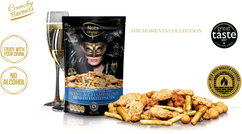 A Nuts Original coloca ao seu dispor soluções únicas e especiais perfeitas para o seu negócio.A cada snack, um novo sabor, uma nova viagem – um verdadeiro momento de degustação! Os “Nuts Original” destinam-se aos apreciadores de bebidas de qualidade como Gins, Cervejas Premium e Artesanais, Champanhe, Vinhos, … Que pedem para ser acompanhados por um snack aperitivo requintado, que permita ressaltar ainda mais o seu sabor.