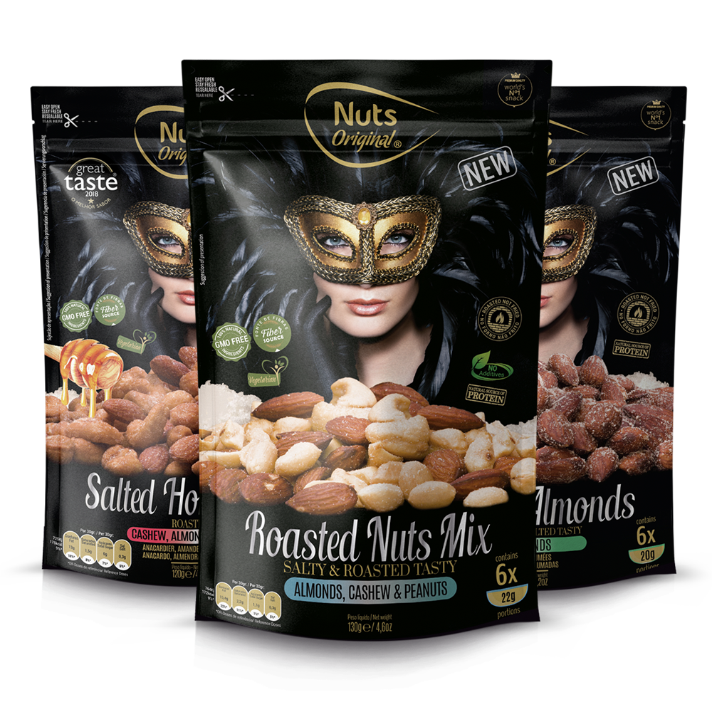Os “Nuts Original” destinam-se aos apreciadores de bebidas de qualidade como Gins, Cervejas Premium e Artesanais, Champanhe, Vinhos que pedem para ser acompanhados por um snack aperitivo que permita ressaltar ainda mais o seu sabor.